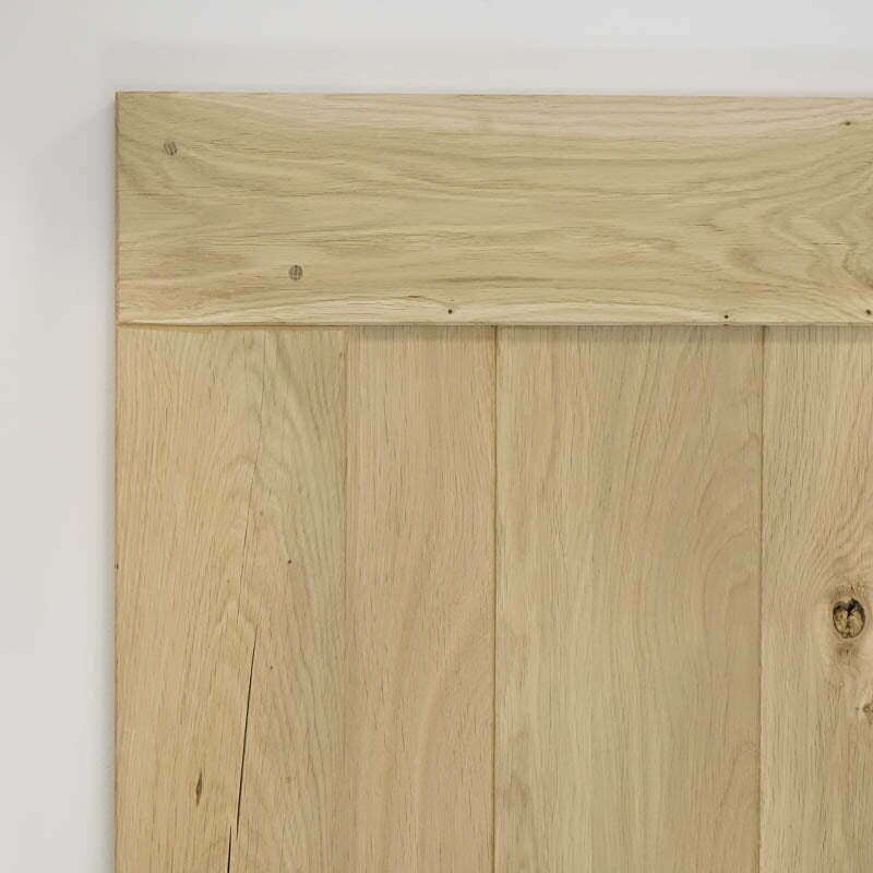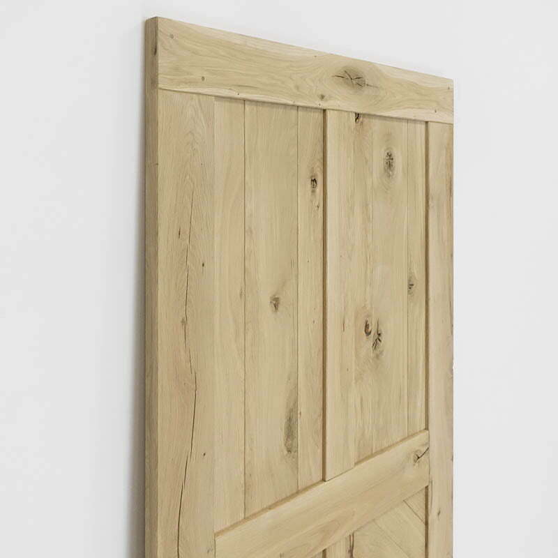 Deze schuifdeur is gemaakt van massief, onbehandeld eikenhout. Bij deze houten schuifdeur kun je zelf kiezen welk schuifdeursysteem je er bij zou willen kopen. De deur wordt dan volledig naar jouw wensen bij je afgeleverd.