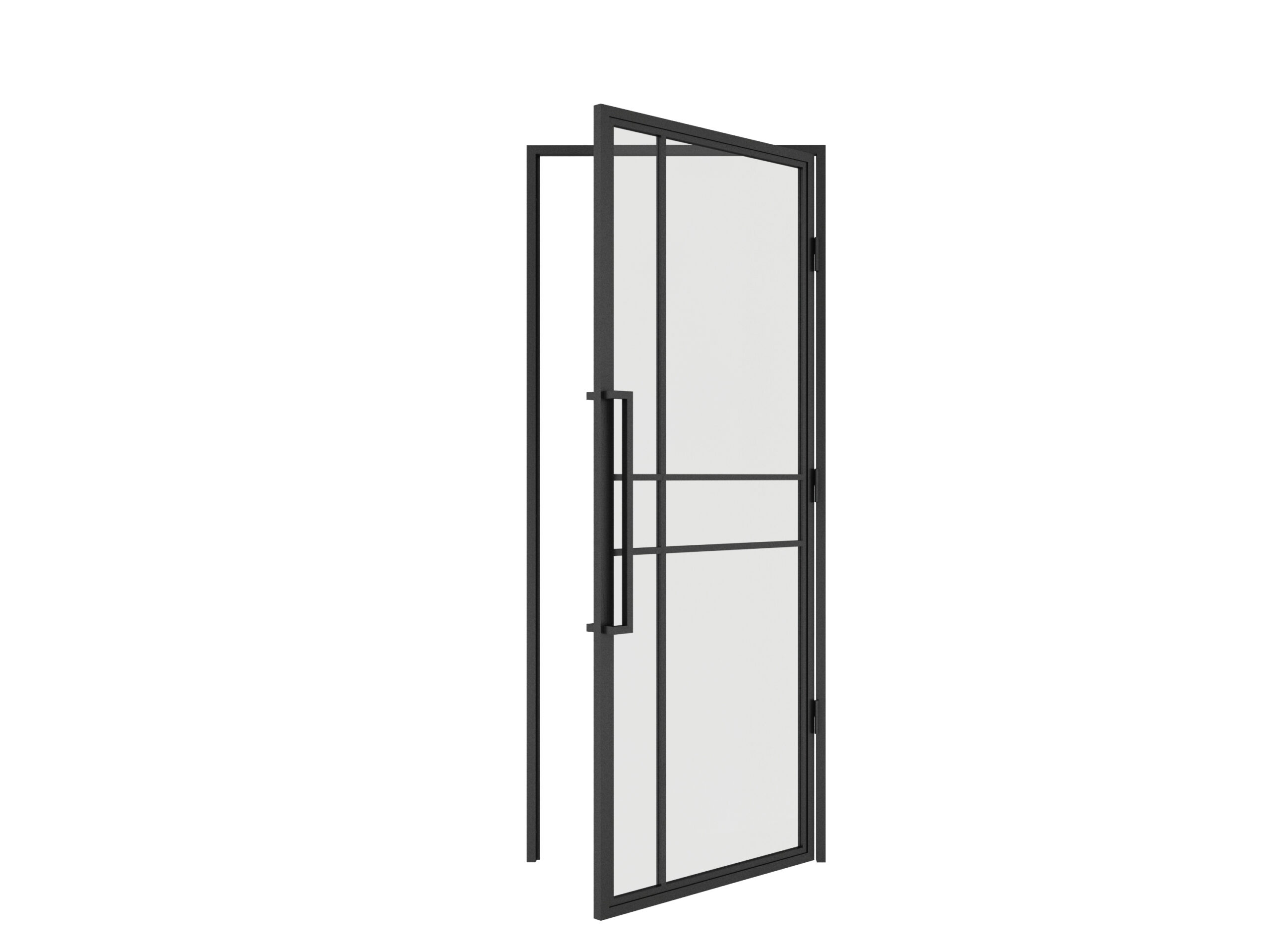 Stalen draaideur (1 mm staal) met veiligheidsglas (4mm), moderne greep en bevestigingsmateriaal.