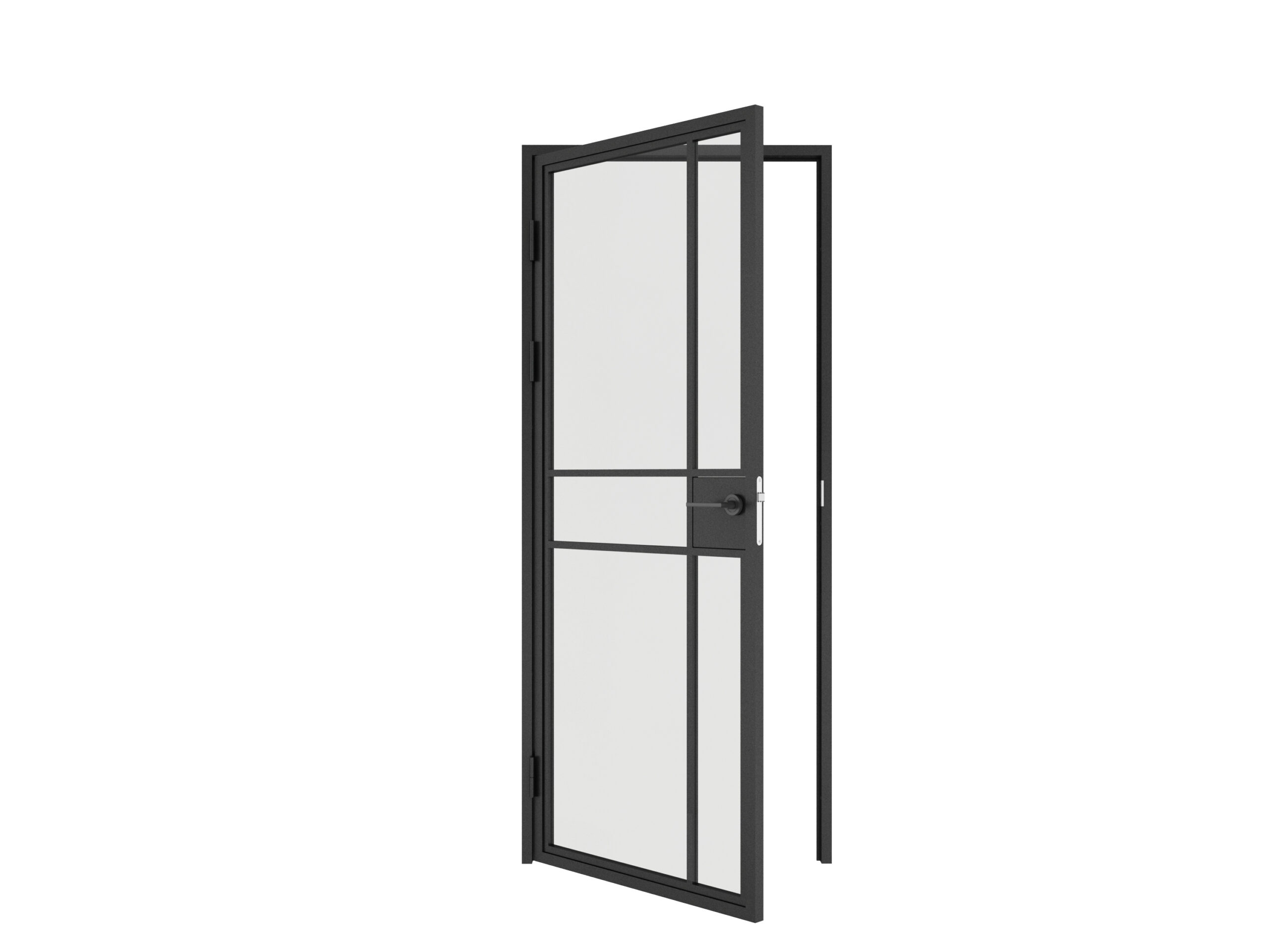 Maatwerk stalen scharnierdeur met klink 6 vakken asymmetrisch linksdraaiend helder glas