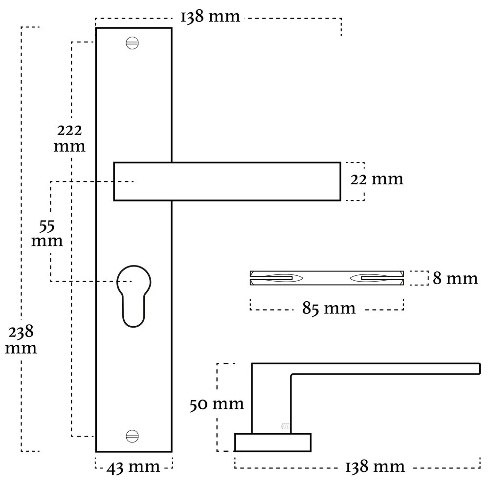 Geveerde Deurklink Lusso met schild, profielcilindergat PC 55mm