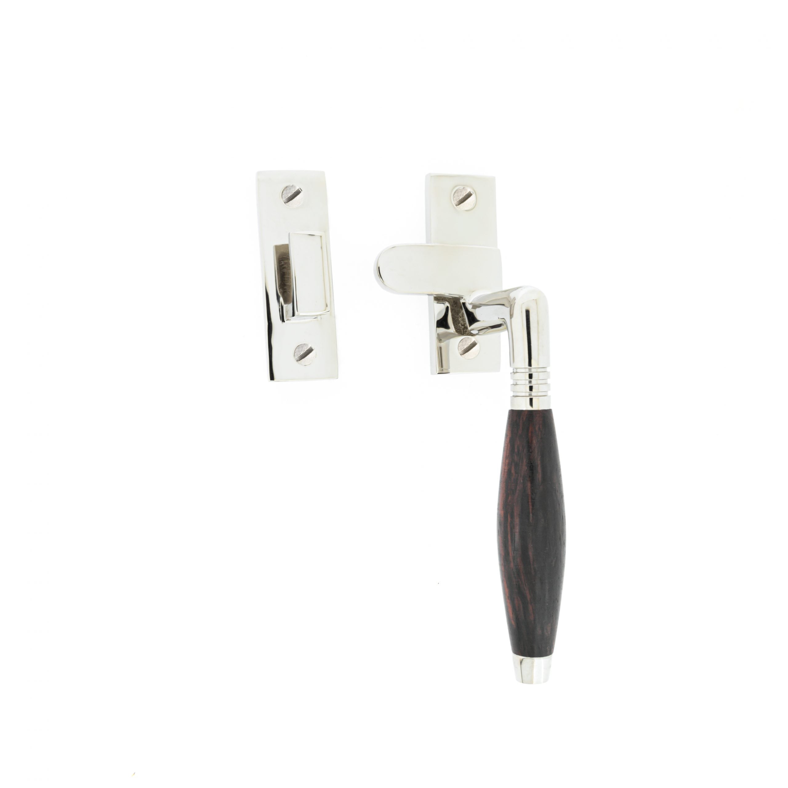 De raamsluiter is gemaakt van glanzend nikkel, gecombineerd met palissanderhout. Liever een andere kleur of houtsoort? Bekijk dan onze collectie raamsluitingen.