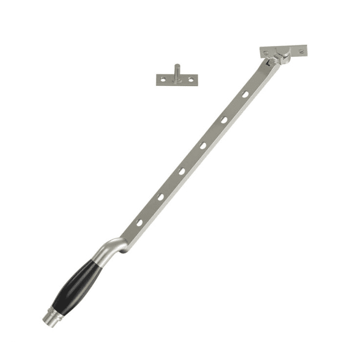 de Raamuitzetter Ton 400 / Nikkel Donker kan op de meeste draairamen gemonteerd worden. Vervolgens kun je het venster openen op meerdere posities, het mechanisme is stevig verankerd waardoor wind geen invloed meer heeft. Dit type heeft de bekende gaatjes in het profiel. De meegeleverde haak wordt bevestigd aan het kozijn, het profiel heeft zes gaatjes waarmee je het raam op elke gewenste stand kunt openen. Om ervoor te zorgen dat het profiel bij sterke windstoten los kan raken, is de onderzijde voorzien van een gebogen rand.