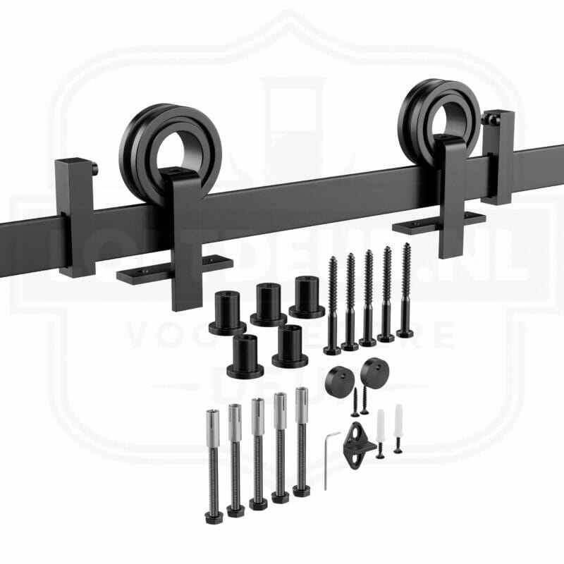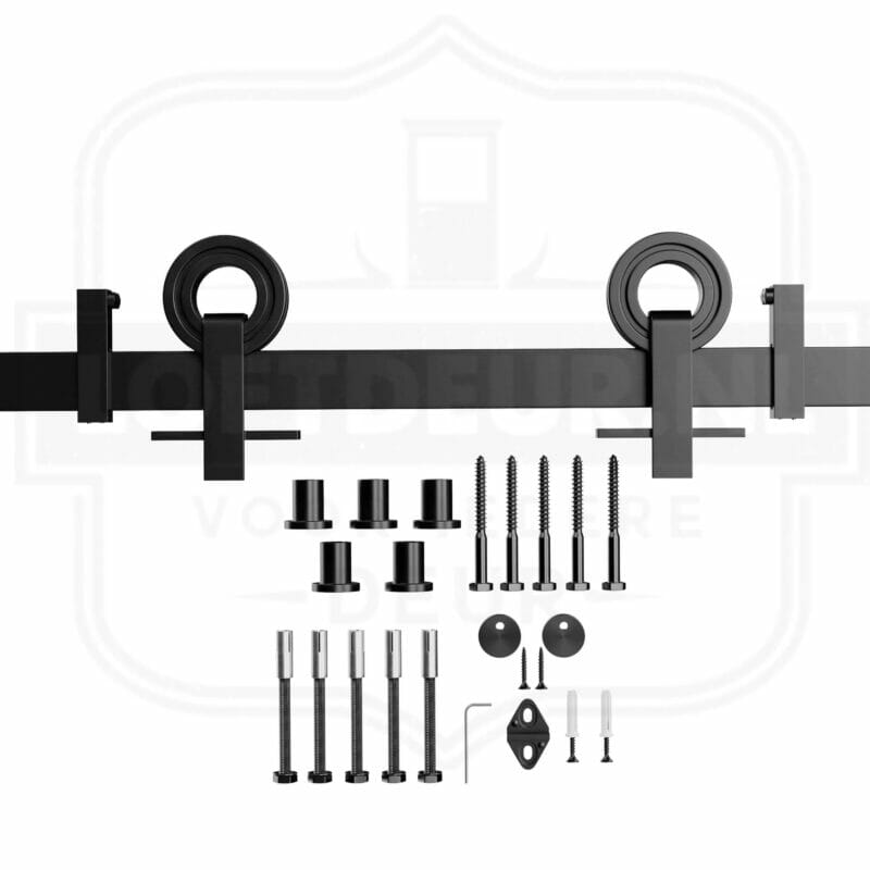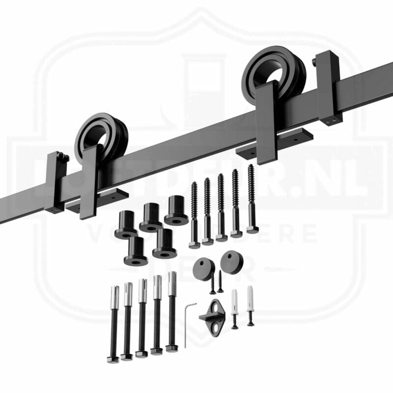Net zoals de andere schuifdeursystemen die Loftdeur in de collectie heeft, wordt ook het Top Design schuifdeurbeslag compleet geleverd met alle onderdelen die nodig zijn om jouw loftdeur naar keuze eenvoudig aan de wand te bevestigen, voor jarenlang wooncomfort.Wij leveren het schuifdeursysteem ‘Top Design’ als set: