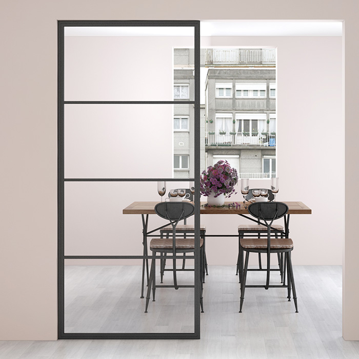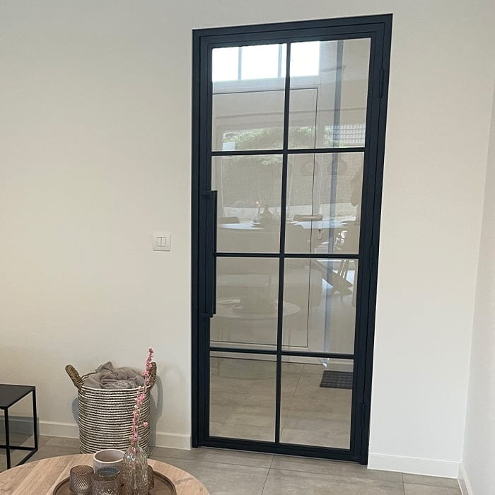 €749,00Maatwerk stalen scharnierdeur 6 vakken asymmetrisch rechtsdraaiend helder glas